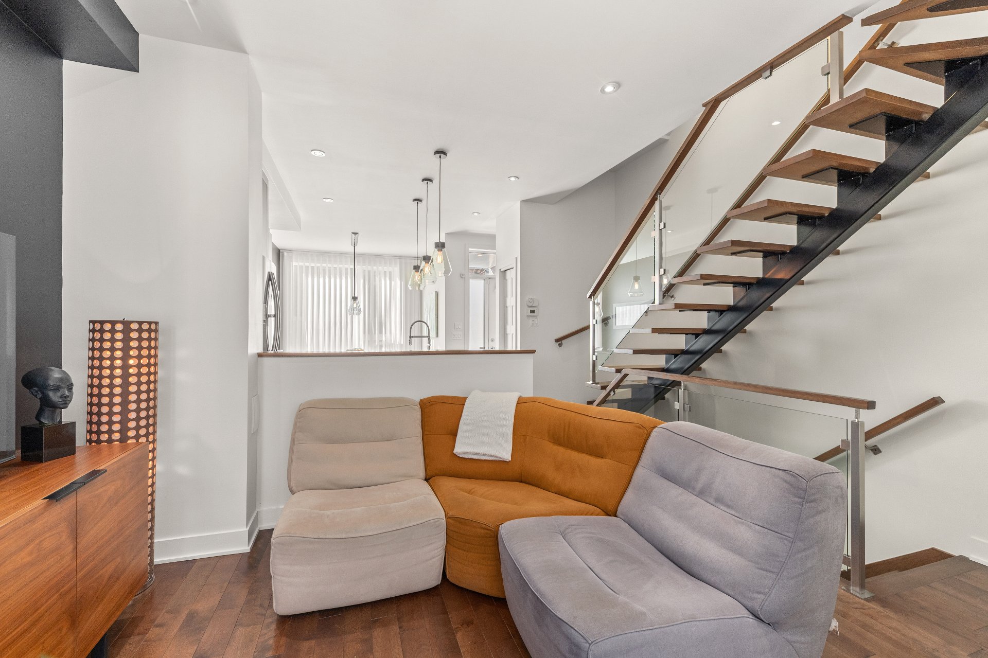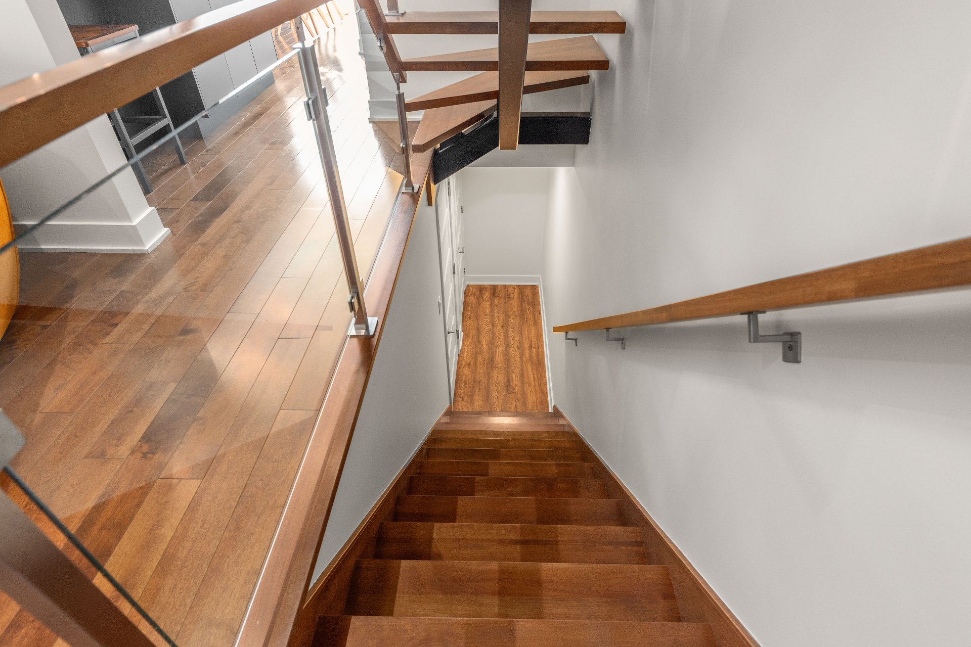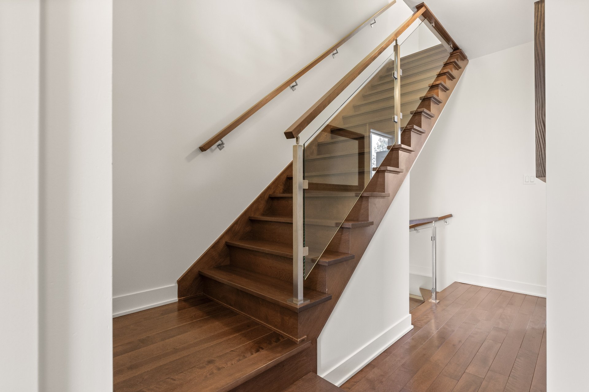 Open staircase with central beam and glass railings