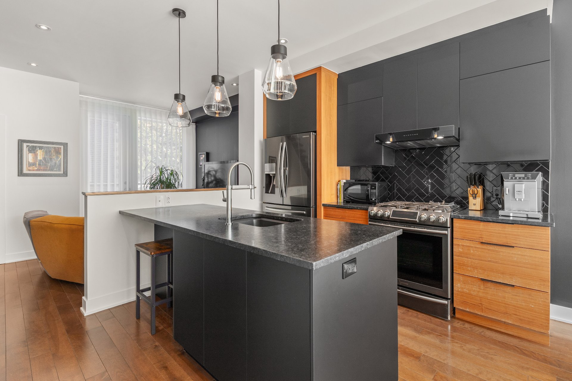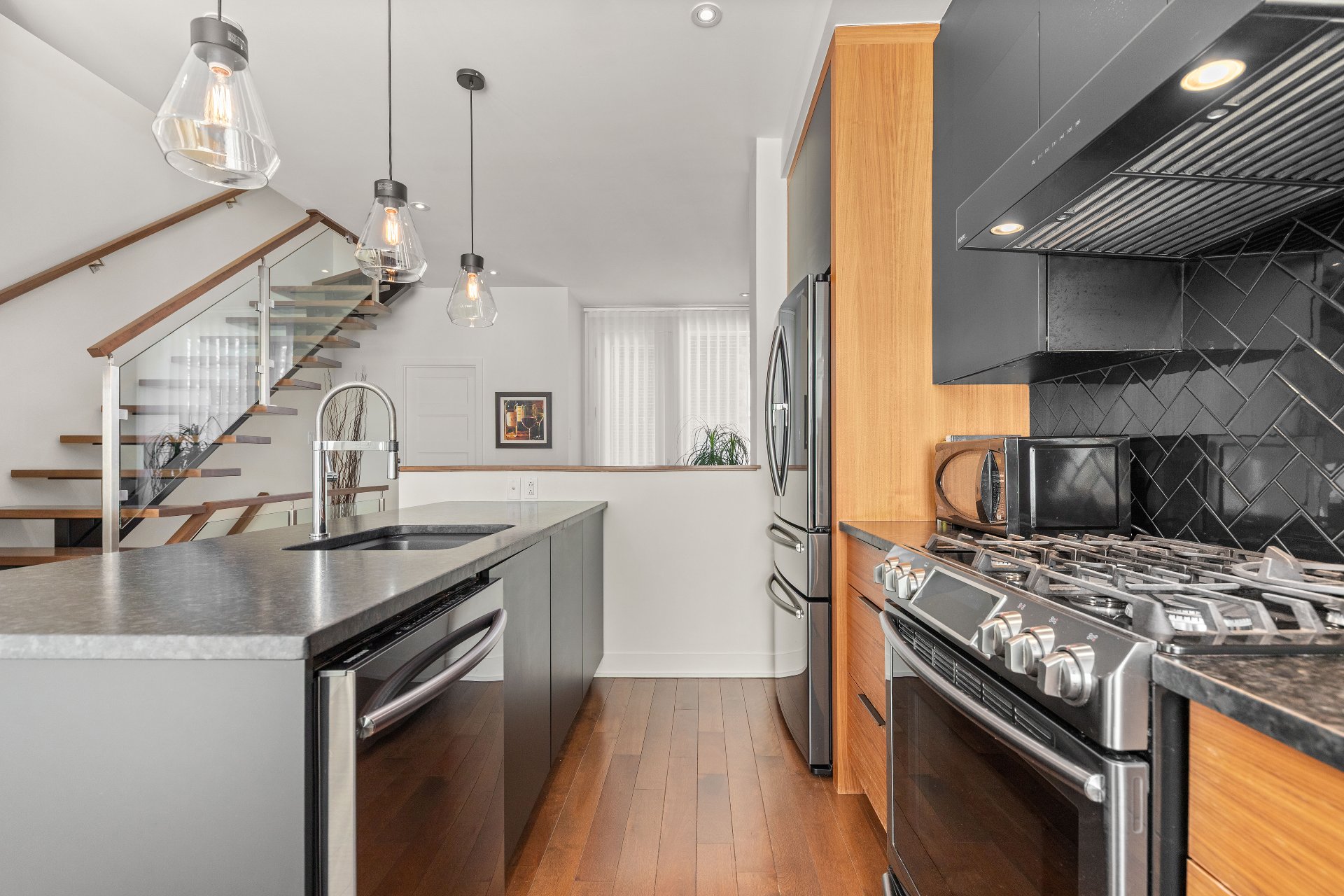 kitchen (black, wood, and stainless steel) with a gas